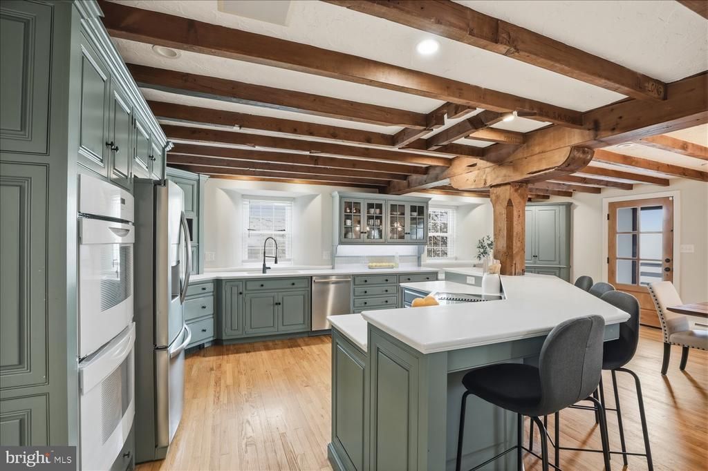 Welcome to 475 Snavely Mill Rd, a remarkable 4 bedroom, 3.5 bath residence set on approximately 5.8 acres in Lititz. Originally established in the late 1700s and rebuilt in the mid 1800s, this historic grist mill has been thoughtfully converted into a private home, preserving its timeless stone construction and architectural character. Offering 3,992 square feet across three levels, the residence seamlessly blends heritage details with modern comforts. Set against a scenic creekside backdrop, the property offers a private pond with an electrically operated fountain , expansive grounds, and a collection of outdoor spaces designed for both relaxation and entertaining guests, including a side wood deck, rear patio, stone walkways, fountain, and exterior lighting, while balcony access from each level provides multiple vantage points to enjoy the surrounding landscape. Inside, the home reveals a warm and inviting foyer with wood floors, exposed beams, wood columns, chandelier, and bay windows. The kitchen is well appointed with built in cabinetry, Corian countertops, Jenn Air appliances, and access to the home’s integrated sound system, which extends through the main living areas and primary suite, with doors leading directly to the side deck for seamless indoor outdoor living. An adjacent office or bonus room features built ins, shiplap accents, and natural light, and a half bath completes the main level. The dining area flows into a striking two story family room defined by exposed beams, a stone fireplace, and expansive windows that fill the space with natural light. The lower level offers additional living space, including a family room with a brick fireplace, a versatile bonus room or bedroom, and a full bath, while the unfinished portion provides storage, utility space, and access to the exterior and garage. Upstairs, a loft overlooks the family room, and the primary suite serves as a private retreat with exposed beams, bay windows, a walk in closet with built ins, and an en suite bath featuring a soaking tub, walk in shower made with tiles imported from Italy, bidet, dual vanities with marble counters, and integrated speakers. Two additional bedrooms on this level feature new carpet, ample built in closet space, bay windows, and abundant natural light, and the full hall bath includes tile flooring with a stall shower and tub combination. The third floor provides additional unfinished space with original wood flooring and exposed beams, ideal for storage. The attached garage is equipped with a car lift and includes additional unfinished storage space above. Schedule your private showing today!