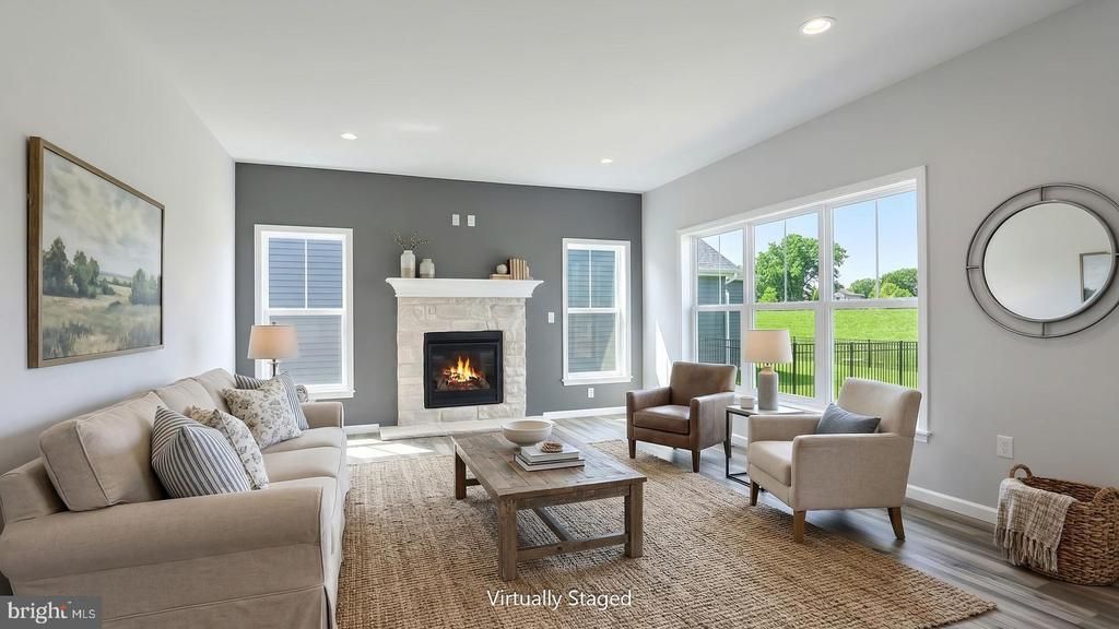 This 2-story home features an open floor plan, generous living spaces, and a 2-car garage with mudroom entry. The first floor boasts 9ft ceilings and stylish vinyl plank flooring throughout the main living areas. A versatile flex space to the front of the home can be used as an office or den. The open kitchen features stainless steel appliances, quartz countertops with tile backsplash, and a large island and pantry. Adjacent to the kitchen is the sunny dining area with sliding glass door access to the rear patio. The cozy family room is warmed by a gas fireplace with stone surround. All 4 bedrooms, 2 full baths, and a convenient laundry room can be found on the 2nd floor. The spacious owner’s suite includes an expansive closet, tile shower and double bowl vanity. Images may include virtual furnishings for illustrative purposes only.